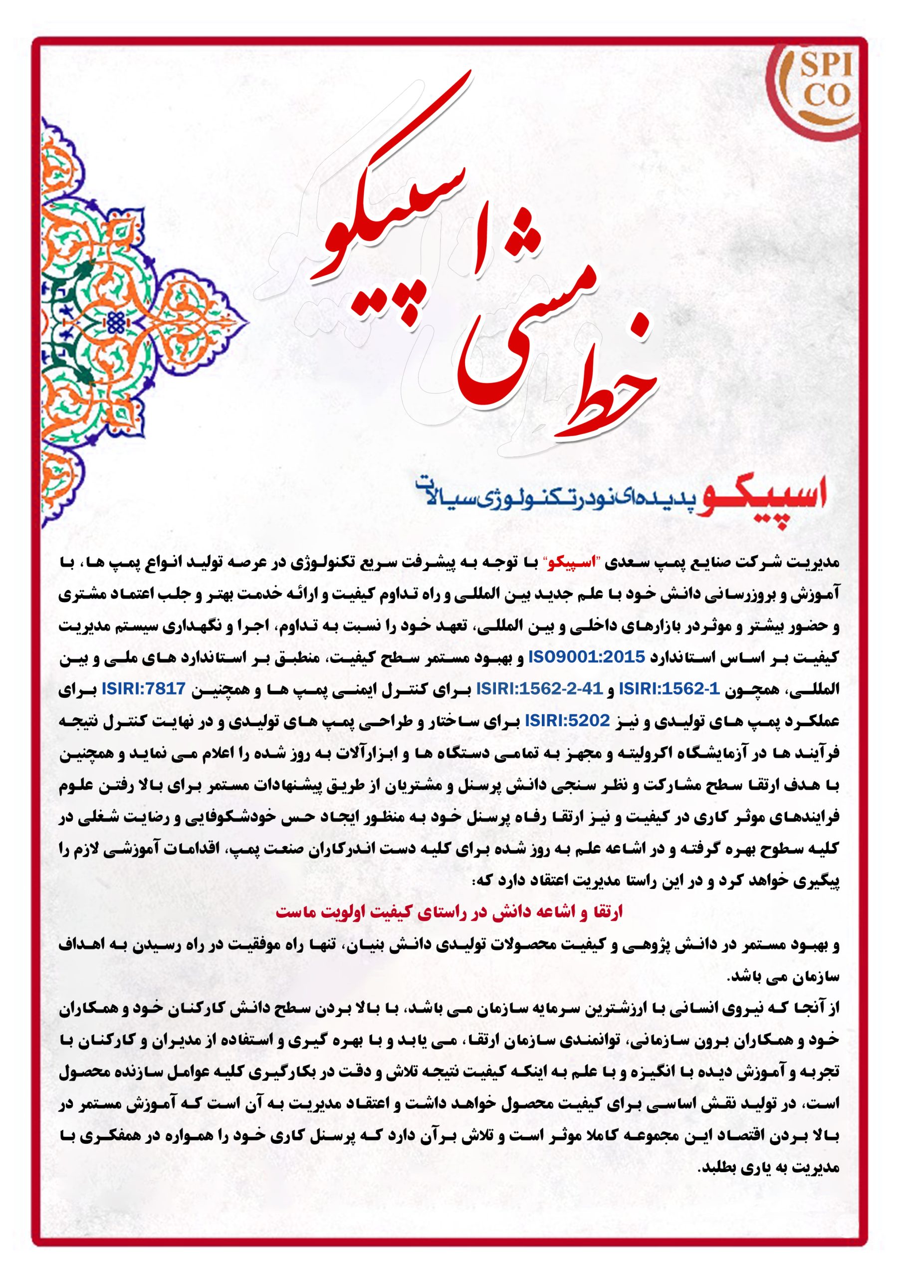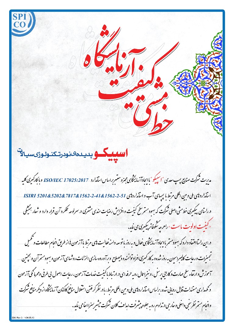 مدیریت شرکت صنایع پمپ سعدی “اسپیکو” با ایجاد آزمایشگاهی مجهز و معتبر بر اساس استاندارد ISO/IEC 17025:2017 و با به کار گیری کلیه استاندارد های ملی و بین المللی مرتبط با پمپ های آب و استاندارد های ISIRI 5201 & 5202 & 7817 & 1562-2-41 & 1562-2-51 در راستای پیگیری خط مشی اصلی شرکت که بهبود مستمر سطح کیفیت و افزایش رضایت مندی مشتری در سرلوحه عملکرد آن قرار دارد و شعار همیشگی «کیفیت اولویت ماست» را هر چه شکوفاتر پیگیری می نماید.