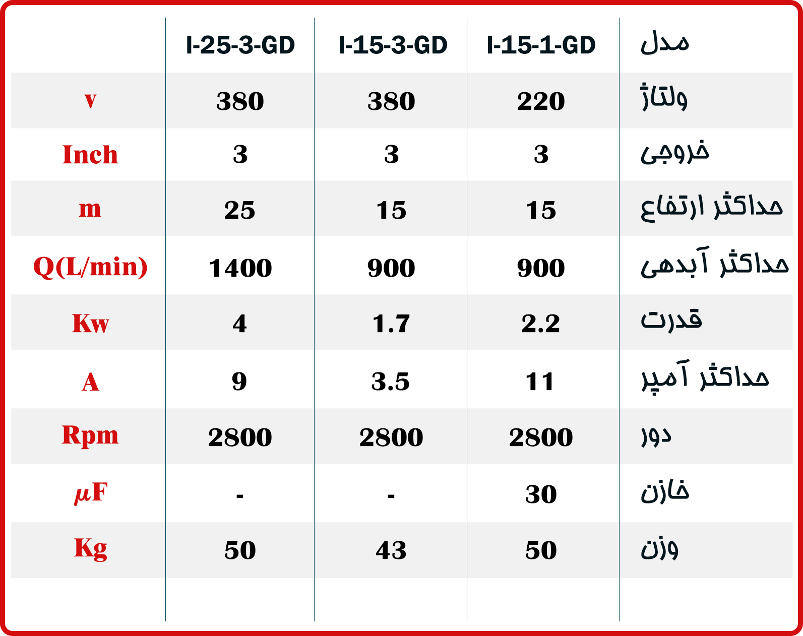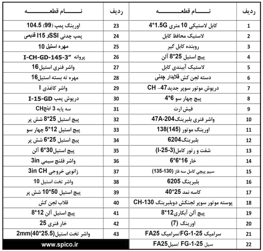 3 | 1001135 | روبنده كابل گير | 24 | 1020555 | پمپ 3اینچ جدید CH-I15 |